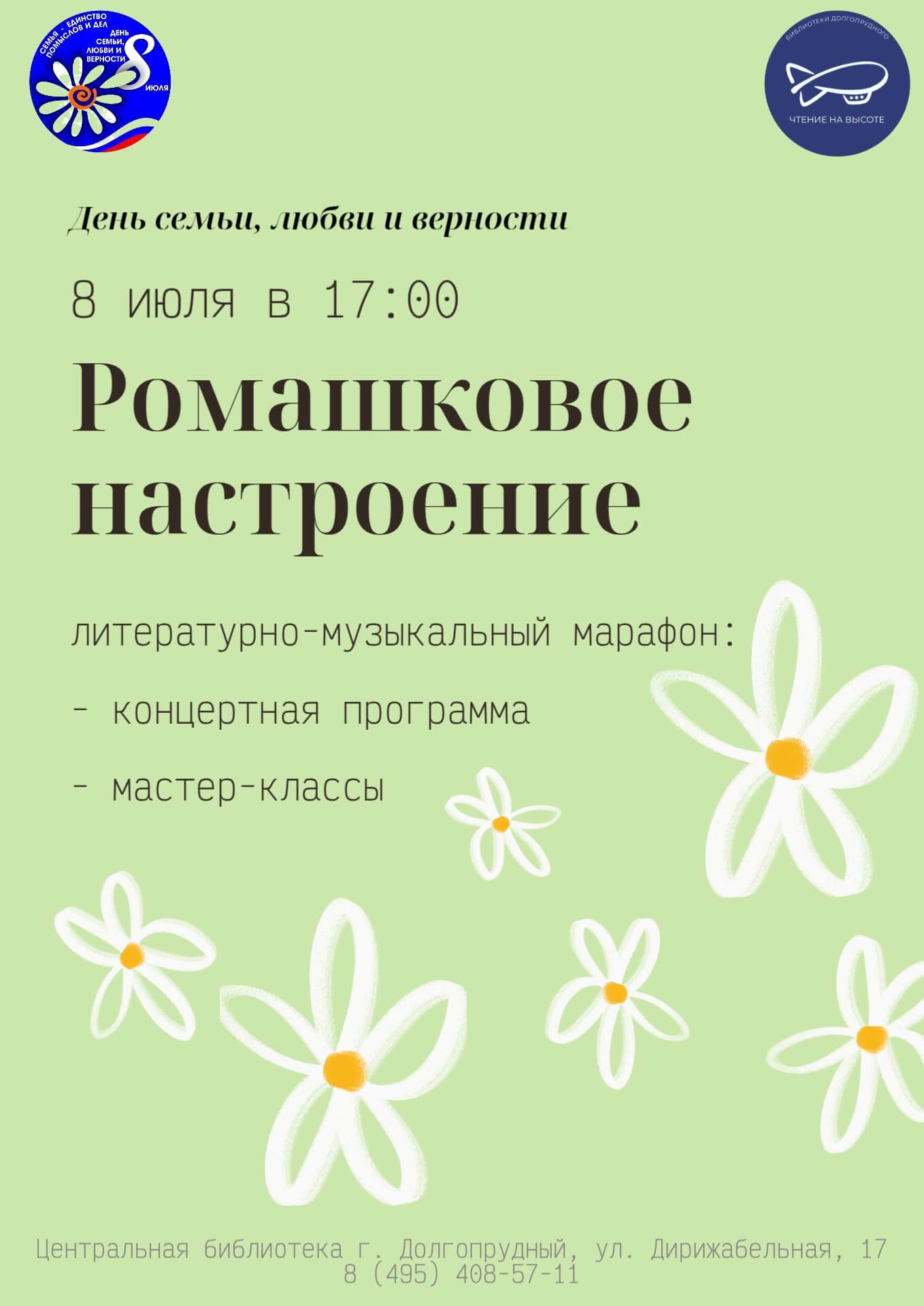 Приглашаем всю семью на праздник ко Дню семьи, любви и верности! В программе вечера: • Концертная программа — любимые песни и трогательные музыкальные номера о семье, любви и преданности. • Мастер-классы — творим вместе: цветочная фотозона, самодельные ромашки и другие милые сувениры. Когда: 8 июля, 17:00 Где: Сквер у Центральной библиотеки г. Долгопрудный.