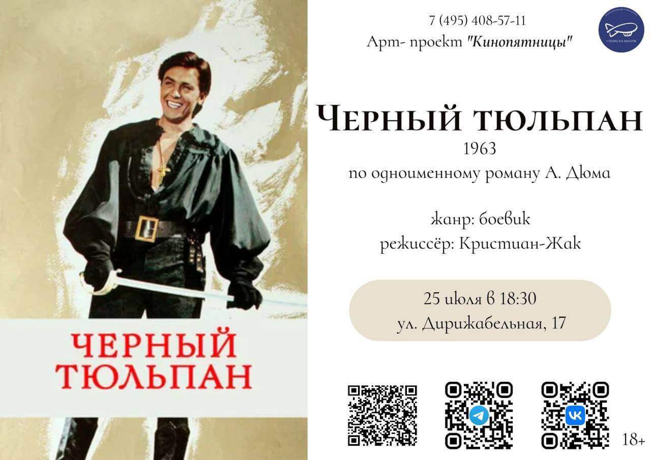 «Накануне Французской революции в тихой провинции жуткий страх наводит на знатных мерзавцев таинственный разбойник в маске, чьим фирменным знаком стал черный тюльпан. Неуловимый мститель находчив, бесстрашен, благороден и умен, он прекрасный наездник и гений фехтования. Дворянин Жульен — беспечный неженка, глупый и трусливый — совсем на него не похож. Но никто не знает, что есть нечто, крепко связывающее этих двоих…» Приглашаем вас на вечер просмотра фильма на большом экране, в уютной атмосфере и в хорошей компании!
