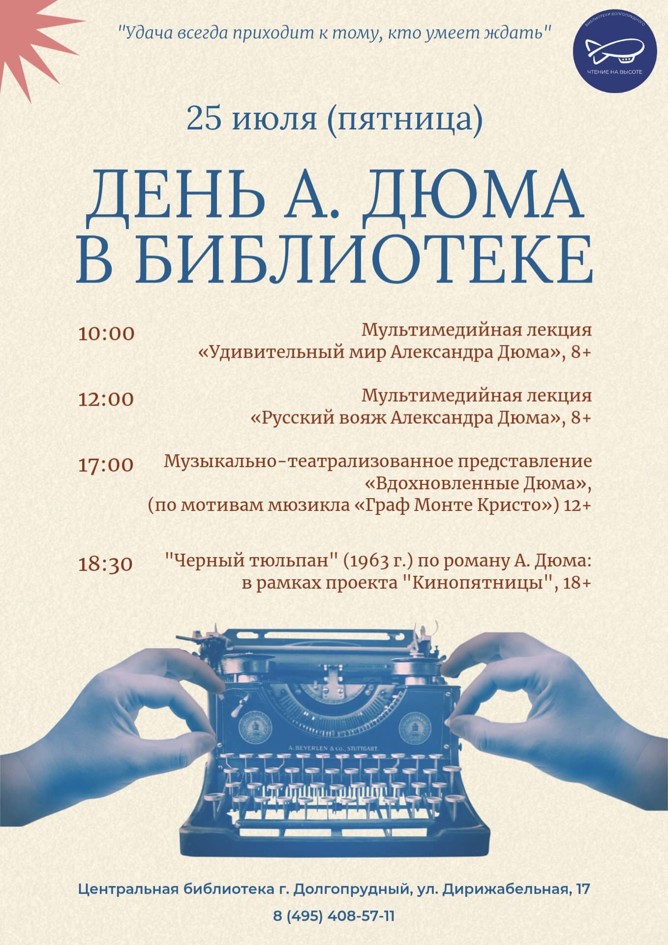 25 июля с 10:00 до 20:00, Центральная библиотека г. Долгопрудный, ул. Дирижабельная, 17. Атмосфера Парижа XVII века, дух приключений и великая фраза: «Один за всех — и все за одного!»
