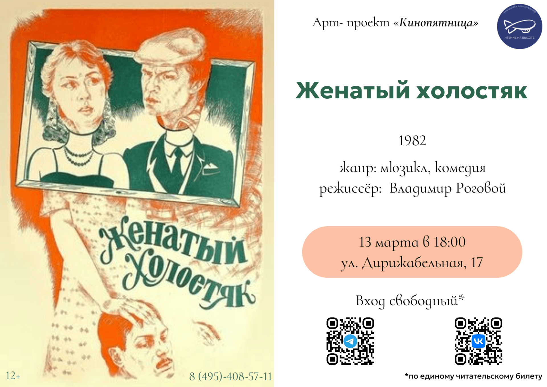 13 марта в 18:00 мы будем смотреть советскую музыкальную комедию 1982 года «Женатый холостяк» режиссёра Владимира Рогового. Сюжет фильма разворачивается вокруг Тамары, которая в поезде знакомится с Сергеем. Она признаётся попутчику, что развелась с мужем и боится сообщить об этом родителям — с ними она не виделась несколько лет. По стечению обстоятельств Сергей, притворившись её супругом, знакомится с семьёй Тамары. Как далеко зайдёт это притворство — остаётся только гадать. История о любви, случайных встречах и неожиданном счастье ждёт вас!