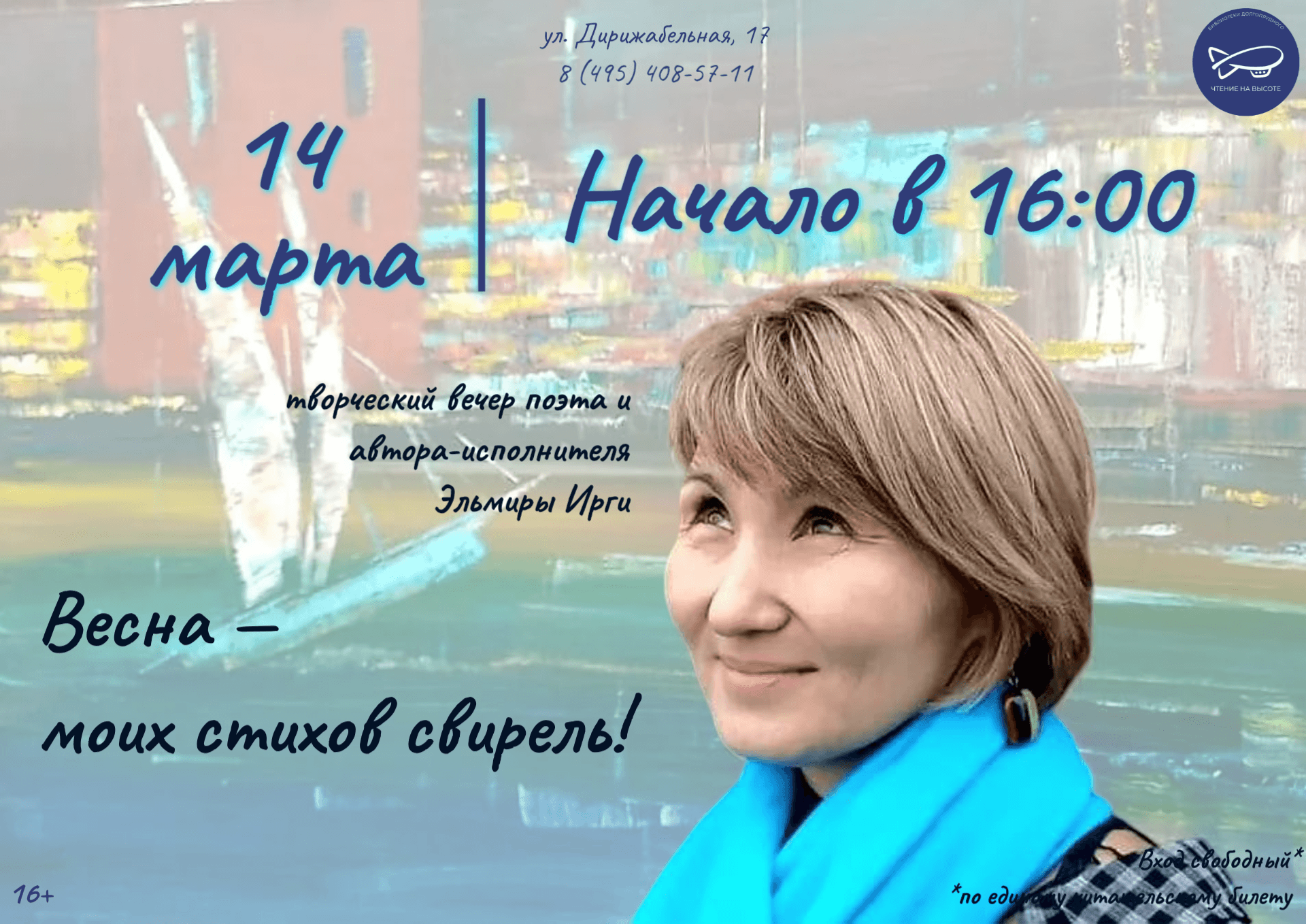 Приглашаем вас на концертную программу «Весна — моих стихов свирель» — творческий вечер Эльмиры Ирги, поэта и автора-исполнителя.