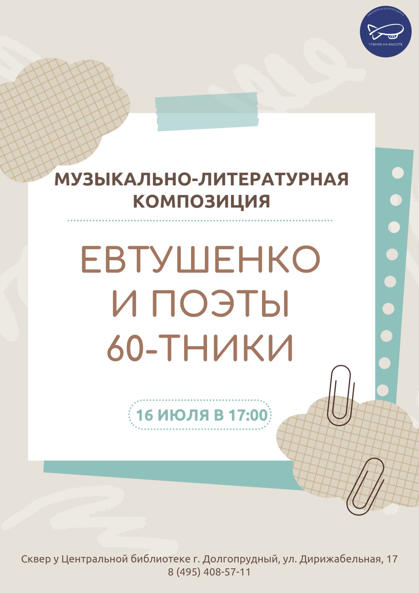 16 июля в 17:00, сквер у Центральной библиотеки г. Долгопрудный, ул. Дирижабельная, 17.